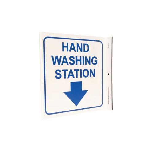 ZING Projecting Sign, "Hand Washing Station," clearly communicates hand washing locations. The two-sided projecting design significantly increases visibility, and is ideal for designating critical workplace locations. The sign is made in the USA from 70% post-consumer recycled plastic, and measures 7"H x 2.5"W x 7" projecting. Recycled materials support sustainability initiatives and LEED credits.