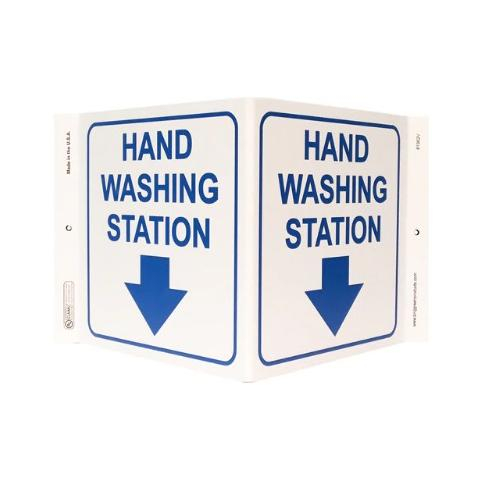 ZING Projecting Sign, "Hand Washing Station," clearly communicates hand washing locations. The two-sided projecting design significantly increases visibility, and is ideal for designating critical workplace locations. The sign is made in the USA from 70% post-consumer recycled plastic, and measures 7"H x 12"W x 5" projecting. Recycled materials support sustainability initiatives and LEED credits.