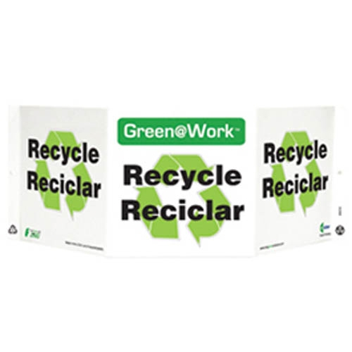 When going green, rely on this Green at Work™ Tri-View Sign "Recycle Reciclar" in bilingual English/Spanish and recycle symbol to remind employees on the recycle aspect of corporate go green strategies and guide them on where to deposit recyclable products. Three-sided Tri-View Sign offers a 180-degree view giving improved visibility.
