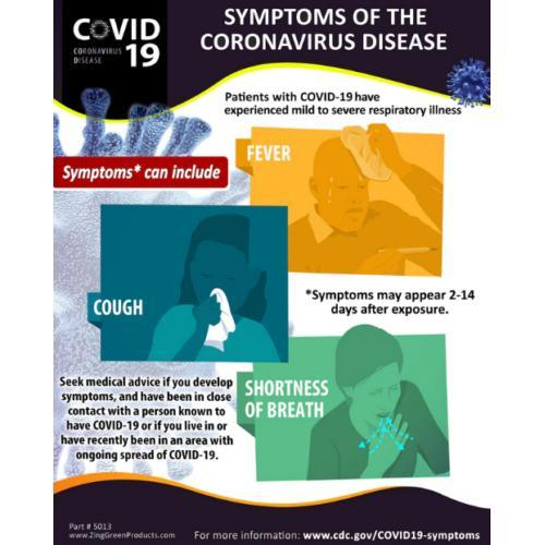 Coronavirus Safety Posters provide critical information about COVID19. This poster clearly details the symptoms of COVID19 and the precautions one should take if experiencing symptoms. The poster measures 16" x 20" and is made in the USA from recycled materials.