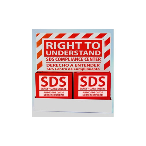 Zing™ Eco-SDS Bilingual (English/Spanish) Compliance/Training Centers prominently store important safety and training documents to comply with the new GHS/Hazard Communication requirements. Stations are highly visible with their red/white colors and include 2 SDS Binders (1.5" Ring) that holds up to 300 sheets each. Stations are constructed from virtually indestructible .060 thick 99% recycled aluminum that reinforce sustainability initiatives as well as compliance. Recycled materials support LEED credits. Measures 23.25"H x 27.5"W x 4.75" D. Made in the USA.