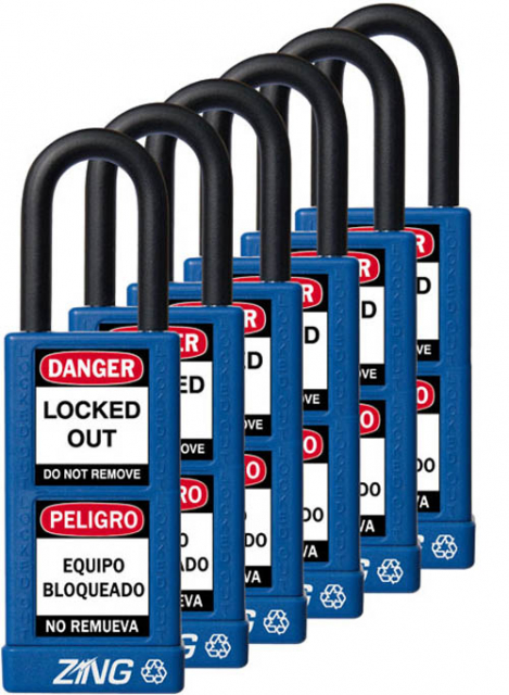 Protect employees and the environment with RecycLock™ Safety Padlocks, Keyed Alike Sets and other Zing Green Recycled Safety Padlocks that Lockout Designated Areas from entry. Padlock is Keyed Alike and comes with one key that can be used with other padlocks within the same set. Padlock features a solid aluminum body with plastic jacket and 1/4" diameter steel shackle. Precision 6-pin cylinder has key-retaining and auto-locking functions. Lock is made from 70% recycled materials, contains no PVC and uses food industry approved lubricants. Padlock body is Blue and measures 3" Length and shackle measures 1-1/2" Length. 6 Packlocks per Set.
