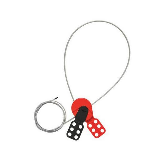Cable Lockout Hasp, 6 ft. cable, provides an effective, multi-purpose solution to lockout compliance. The device measures 1"D x 5"H x 2-1/2"W, and accommodates 6 padlocks with a maximum shackle diameter of 3/8". The hasp is made from durable plastic, with a coated steel cable.