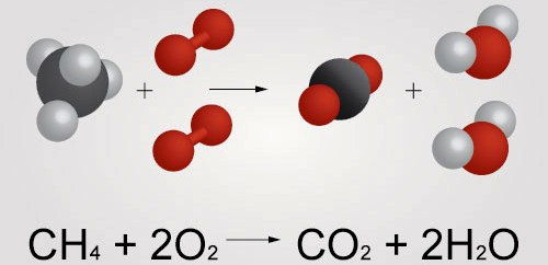 CH4 + 2O2 => CO2 + 2H2O Reactants => Products + Heat |