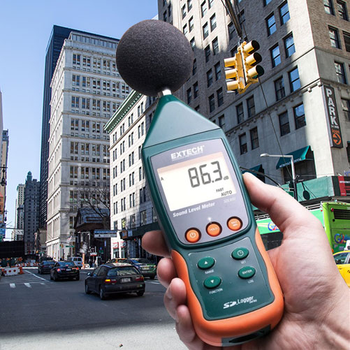 A Sound Level Meter (SLM), also known as a Decibel meter, is the basic hand-held instrument used for measuring general area noise levels. You can use them to spot check noises such as hums, noises from industrial machinery or equipment (i.e. large trucks, jackhammers), or noise across boundaries, such as noise from a construction site or your loud neighbors whether they’re a truck stop or a train station that lets its trains idle during the wee morning hours.