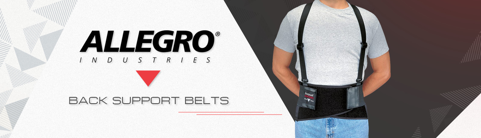 - Allegro’s Bodybelt provides a 9” back support with a 2-part closure. This model has an elastic back and non-elastic side panels. In addition, the Bodybelt features adjustable suspenders. It is available in 4 sizes.