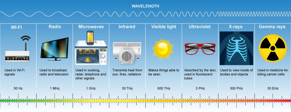The amount of energy found in these photons forms various types of electromagnetic radiation in the spectrum expressed in terms of energy, wavelength, or frequency.