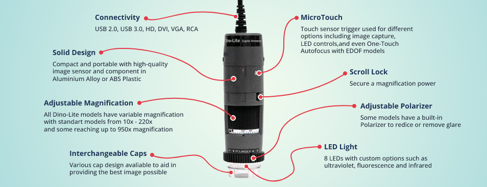 Dino-Lite digital portable microscopes offer you a powerful, feature-reach solution for microscopic observation at magnification up to 90x and 5-megapixel resolution. Top-quality image and durable optics, improved software and developed hardware features give the Dino-Lite a high range to compare with the other products on the market.