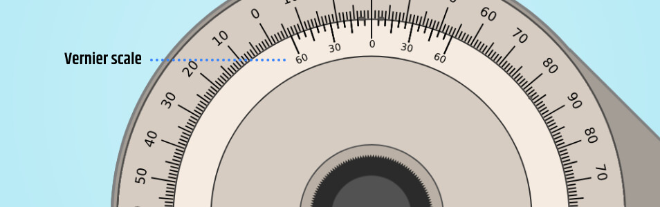 The dial of a universal bevel protractor is graduated from opposite zero marks to 90 degrees each way.