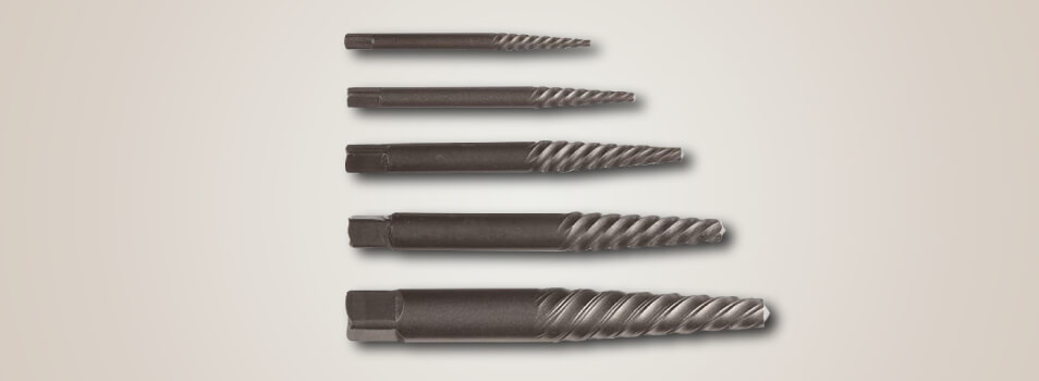 A spiral screw extractor allows removing screws or bolts by fixing them into the hole that was drilled in the fastener’s head with a drill bit. Several screw extractors contain matching drill bits. Some of the tools are double-sided with a drill bit on one side and the extractor on the other.