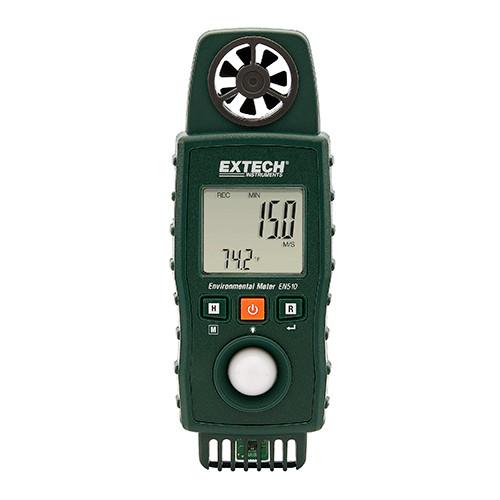 It is a convenient 10-in-1 Environmental Meter measuring Air Velocity, Air Flow, Air Temperature, Type K Temperature, Heat Index, Humidity, Wet Bulb, Dew Point, Windchill, and Light Level. Includes built-in low friction ball bearing mini vane wheel, a precision photodiode with cosine and color correction filter, and a capacitive humidity sensor for high accuracy. The Type K input accepts standard Type K Thermocouple probes to measure surface temperature up to 2372°F (1300°C). Features a large dual LCD with backlighting, Data Hold, and Min/Max function.