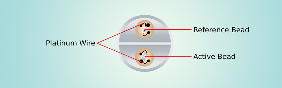 Essentially, there are 2 coils of fine platinum wire. Each of them is embedded in a bead, connected electrically in a Wheatstone bridge circuit, which is used to measure an unknown electrical resistance by balancing two legs of a bridge circuit, one leg of which includes the unknown component. One of the undeniable benefits of this circuit is providing accurate measurements.