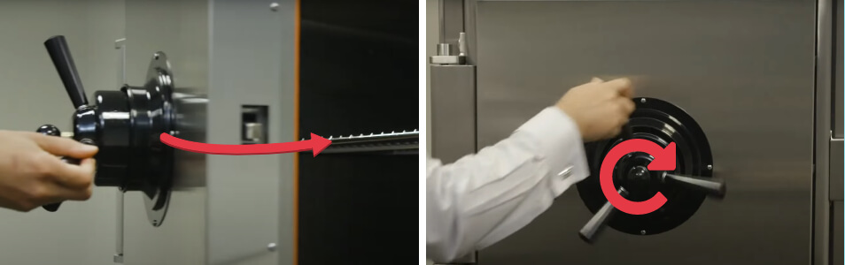 If you have an autoclave with a hinged door, close the door fully. Engage the locking pins and turn the locking mechanism until it stops moving.