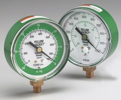 The gauges used with a refrigeration gauge manifold are either analog (with an indicator needle) or digital. In an analog gauge, the position of the needle in relation to the numbers on the gauge face indicates the pressure or vacuum in the refrigeration system, whereas digital gauges provide a numerical reading, indicating system pressure or vacuum.